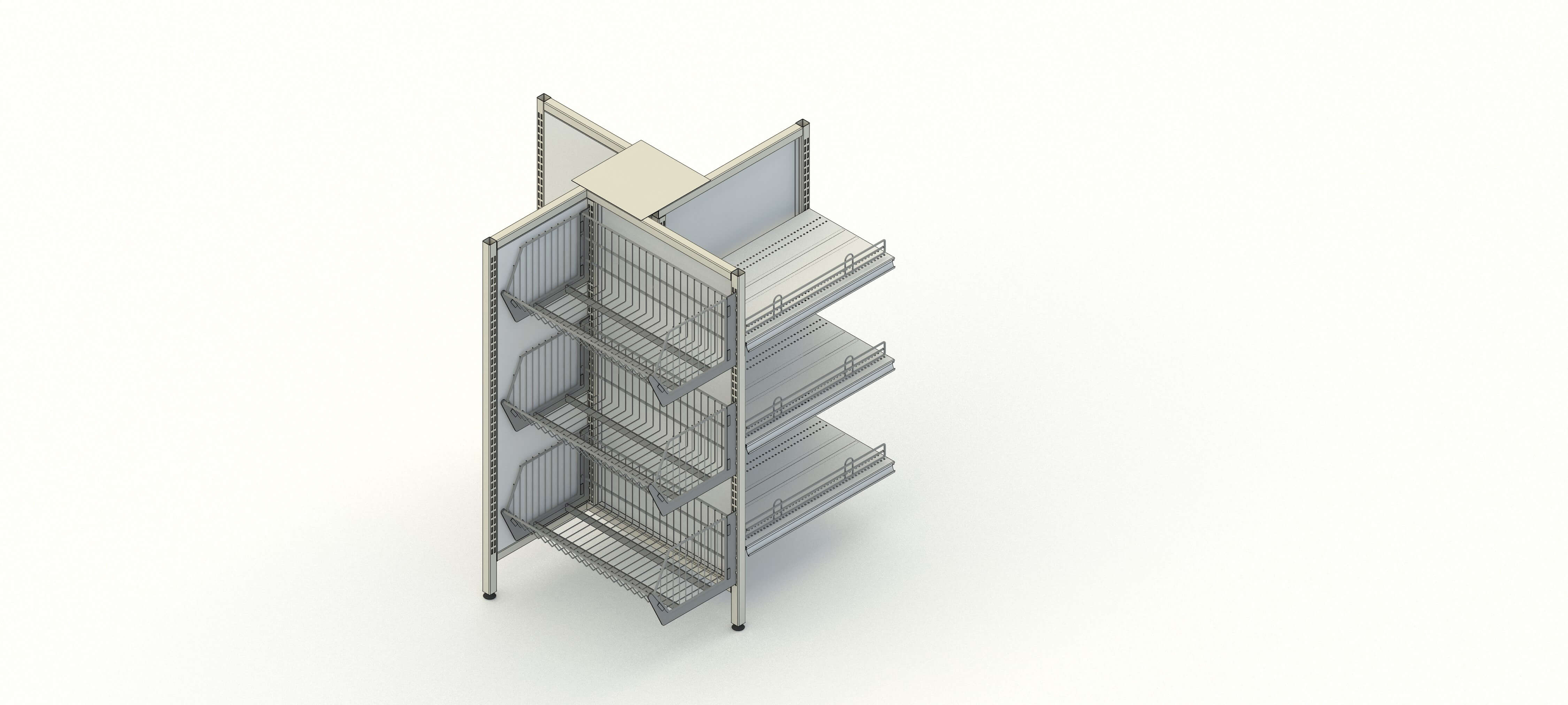 Four-way display shelf / Supermarket display rack / Retail gondola shelving / Promotional display stand / Compact retail shelving / Metal display rack / Space-saving shelf unit / Central display shelf / Store fixture display / Multi-directional retail rack